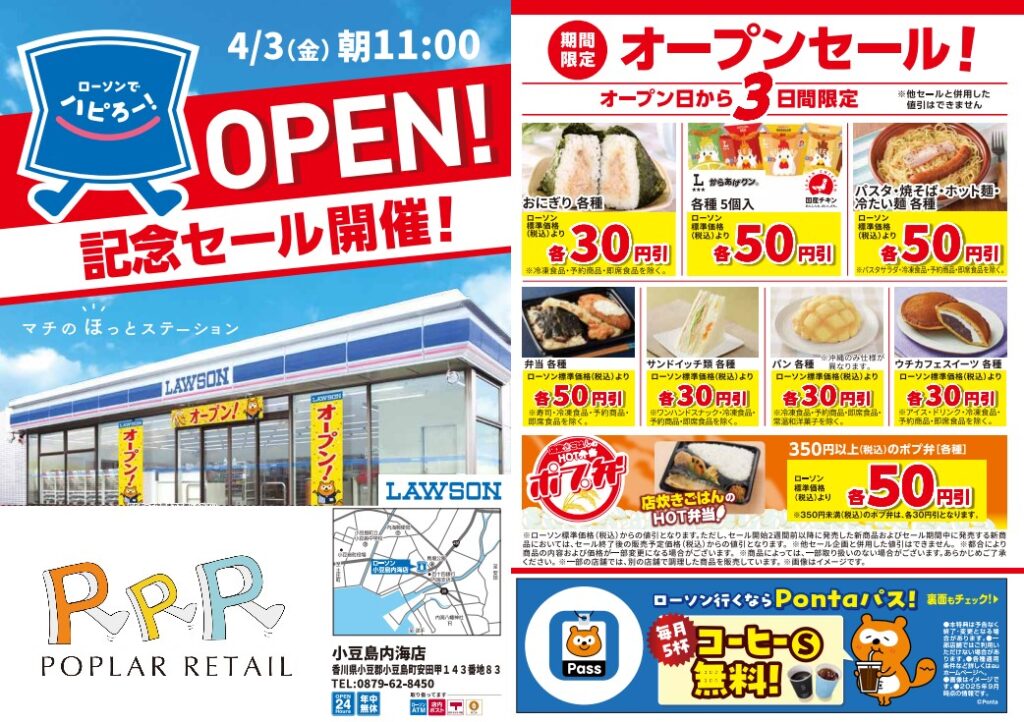 『ローソンポプラ小豆島内海店』オープンセールのお知らせ 4/3(金)11:00オープン『ローソンポプラ小豆島内海店』 オープンから3日間限定でオープンセールを開催いたします。 ぜひお立ち寄りください♪ 前ページへ戻る